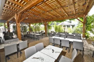 Pension complète et demi-pension. 140 couverts intérieur + 120 extérieur. Buffets, repas privatifs, menus festifs. Vin et jus de fruits du producteur inclus.